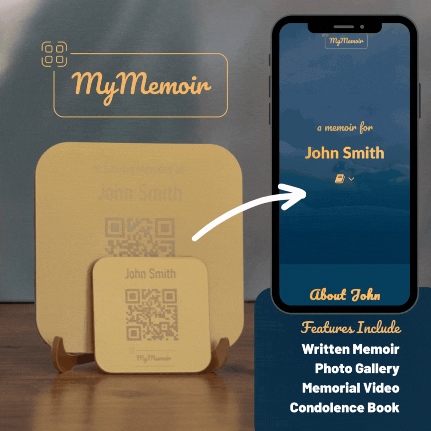 Each one of our memorial plaques contains a unique QR Code, making your chosen plaque one-of-a-kind. Once the QR Code is scanned through your mobile camera, you will be taken to a custom online memoir web page, created for you by the team at MyMemoir with memoir details provided by yourself. Follow the 3 simple steps below to get started.